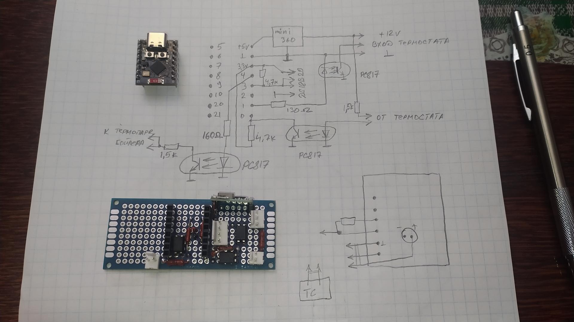 Что надо? Прежде всего, давать команду на вход подключения термостата, что будет разрешать или запрещать работу обогрева дома. Для сохранения функций термостата (на всякий случай, хотя он уже и не нужен) тот теперь подключаю на МК. В прошивке сделал шаблон для байпаса команд термостата котлу – т.е., в одно нажатие можем вернуть штатный режим с внешним управлением. Уже вдогонку – реализовал “обманку” для бойлера, чтобы можно было управлять его подогревом, сняв ту схему, что была собрана когда-то. Для контроля температуры подачи и обратки добавил вход для DS18B20 (просто потому, что – почему бы и нет?). После работ по бойлеру подумал, что можно было бы и в него засунуть контроль температуры – возможно, или использую один из подключенных термодатчиков, или добавлю еще один.